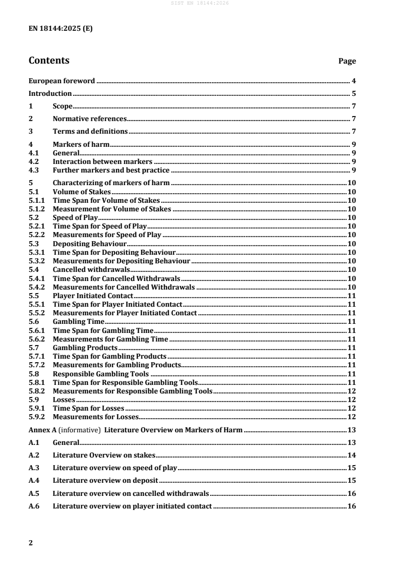 EN 18144:2025 is a standard published by the European Committee for Standardization (CEN). Its full title is "Online gambling - Markers of harm in support of identification and prevention of risky and problem gambling behaviour". This standard covers: This document defines markers of harm in online gambling. It is a minimum set of markers to analyse. The individual indicators can be analysed over additional time spans as well as in excess of those re-quired, and other markers can be added to the analysis as well. In the event that the collection or analysis of data for a limited set of markers is prohibited within a spe-cific jurisdiction (for example, where legislation prevents it), operators can still be compliant with the standard provided that only these markers are omitted, and only for players who fall under that specific jurisdiction. This document does not provide guidelines regarding the interventions to be employed when addressing individuals with gambling issues, nor does it establish predefined thresholds for intervention.