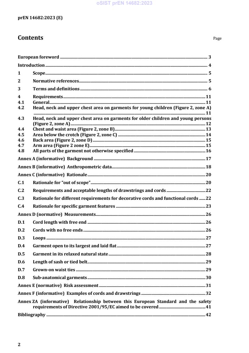 - Measurement and assessment: Annex D covers measurement methods for cord lengths and configurations while Annex E provides guidance on performing a documented risk assessment for individual garments.