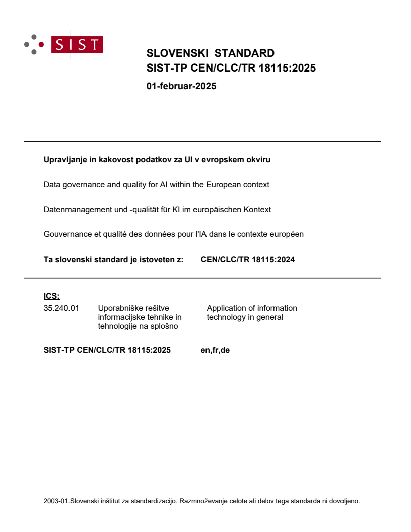 CEN/CLC/TR 18115:2024 - Data governance and quality for AI within the European context is a CEN-CENELEC Technical Report that maps European regulations and international standards relevant to data governance, data quality and the data life cycle for Artificial Intelligence (AI). The report provides an information framework and common terminology to help organizations align AI development, testing and deployment with legal, ethical and technical expectations across Europe.