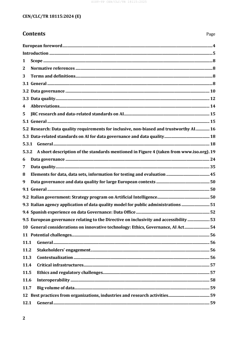 CEN/CLC/TR 18115:2024 is a technical report published by the European Committee for Standardization (CEN). Its full title is "Data governance and quality for AI within the European context". This standard covers: This document provides an overview on AI-related standards, with a focus on data and data life cycles, to organizations, agencies, enterprises, developers, universities, researchers, focus groups, users, and other stakeholders that are experiencing this era of digital transformation. It describes links among the many international standards and regulations published or under development, with the aim of promoting a common language, a greater culture of quality, giving an information framework. It addresses the following areas: - data governance; - data quality; - elements for data, data sets properties to provide unbiased evaluation and information for testing.