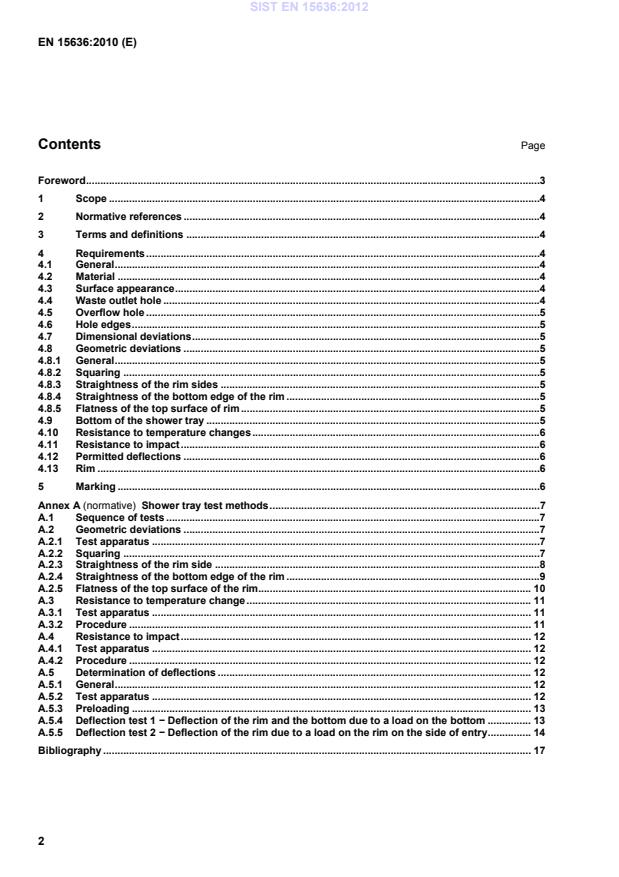 Shower tray test methods .7A.1Sequence of tests .7A.2Geometric deviations .7A.2.1Test apparatus .7A.2.2Squaring .7A.2.3Straightness of the rim side .8A.2.4Straightness of the bottom edge of the rim .9A.2.5Flatness of the top surface of the rim. 10A.3Resistance to temperature change . 11A.3.1Test apparatus . 11A.3.2Procedure . 11A.4Resistance to impact . 12A.4.1Test apparatus . 12A.4.2Procedure . 12A.5Determination of deflections . 12A.5.1General . 12A.5.2Test apparatus . 12A.5.3Preloading . 13A.5.4Deflection test 1 − Deflection of the rim and the bottom due to a load on the bottom . 13A.5.5Deflection test 2 − Deflection of the rim due to a load on the rim on the side of entry . 14Bibliography . 17 SIST EN 15636:2012