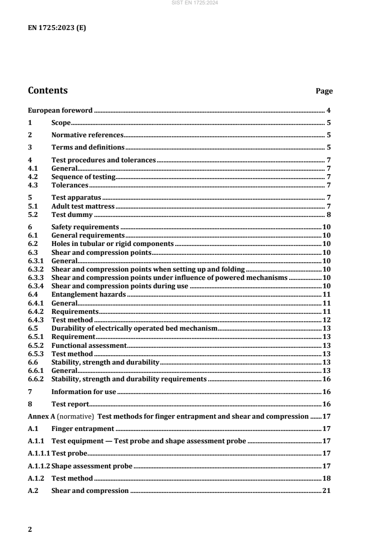 SIST EN 1725:2024 표준은 가정용 및 비가정용 환경에서 성인이 사용하는 모든 종류의 완전히 조립된 침대에 대한 안전성, 강도 및 내구성 요구사항을 규정하고 있습니다. 이 표준은 침대 프레임, 침대 베이스, 매트리스 및 매트리스 패드와 같은 구성 요소를 포함하여, 성인 사용자를 위해 설계된 침대의 포괄적인 요구를 다루고 있습니다. 사용자는 최대 110kg의 체중을 가진 사람으로 설정되어 있으며, 이로 인해 표준의 적용 범위가 명확하게 정의됩니다. 이 표준의 강점 중 하나는 다양한 유형의 침대를 포함하여, 여러 환경에서 사용될 수 있는 침대의 안전성을 보장하는 것입니다. 특히, 추가 기능이 있는 아이템에 대해서도 추가적인 요구 사항이 적용될 수 있으므로, 다기능 침대를 사용하는 소비자들에게도 유용합니다. 또한 Annex A에서는 손가락 끼임에 대한 테스트 방법을 규정하고 있어, 이용자의 안전성을 찾아보는 데에 기여하고 있습니다. 하지만 이 표준은 접이식 침대, 이층 침대 및 의료 침대와 같은 특정 제품에 대해서는 적용되지 않으며, 이는 별도의 표준이 존재하기 때문입니다. 또한 심리적 안전성(예: 노화 저항성, 퇴화, 인화성 및 전기 안전성)에 대한 요구 사항이 포함되어 있지 않음을 유념해야 합니다. 이는 특정 제품군에 대해서는 추가적인 안전 기준이 필요하다는 점을 시사합니다. 결론적으로, EN 1725:2023 표준은 다양한 환경에서 사용할 수 있는 침대의 안전성, 강도 및 내구성을 확보하기 위한 체계적인 접근 방식을 제공하고 있으며, 이를 통해 소비자와 제조업체 모두에게 중요한 기준이 될 것입니다. 사용자의 안전을 중심으로 한 체계적이고 포괄적인 규정이 돋보이며, 향후 제품 개발에 있어 중요한 역할을 할 것입니다.