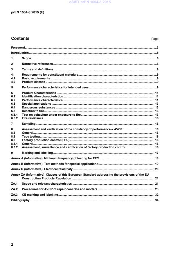 prEN 1504-3 (CEN draft) defines requirements, identification and performance characteristics for repair concrete and mortars used to restore or replace defective concrete and to protect reinforcement. The standard covers both structural and non-structural repair methods and supports conformity assessment and factory production control (AVCP). It addresses characteristics relevant to mechanical resistance, durability and safety in case of fire.