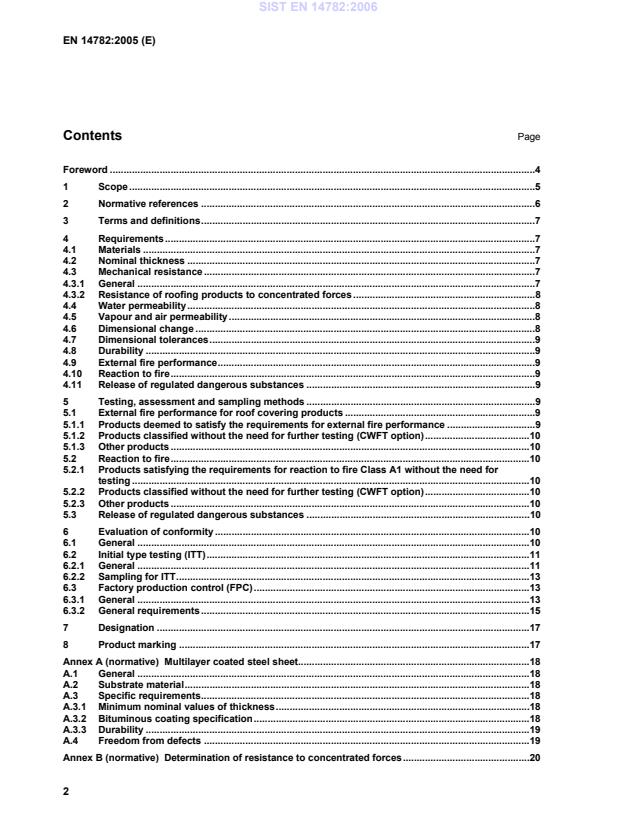 EN 14782:2006 is a standard published by the European Committee for Standardization (CEN). Its full title is "Self-supporting metal sheet for roofing, external cladding and internal lining - Product specification and requirements". This standard covers: This European Standard specifies the terminology, requirements and test methods for factory made self-supporting metal sheets and tiles (for non-structural applications) delivered in the form of manufactured pieces for roofing and wall cladding and lining. This standard also covers ceiling (including internal metal sheet) and soffit applications and cassettes (see Figure 1). This standard covers self-supporting copper, zinc, steel, aluminium and stainless steel sheet with or without coatings, e.g. metallic, organic, inorganic or multi-layer (see Annex A). A moisture retaining layer may be present on the reverse side of the product. This standard also includes rules for marking, labelling and evaluation of conformity. This standard does not cover products for structural purposes, i.e. it does not cover products intended to contribute to the global or partial stability of the building structure by providing racking resistance or resistance to permanent static loads (excluding self-weight of the metal sheet). Requirements concerning acoustical and thermal insulation properties are not considered in this standard. This standard does not include calculation or design requirements with regards to the works, installation techniques or the performance of the installed products.