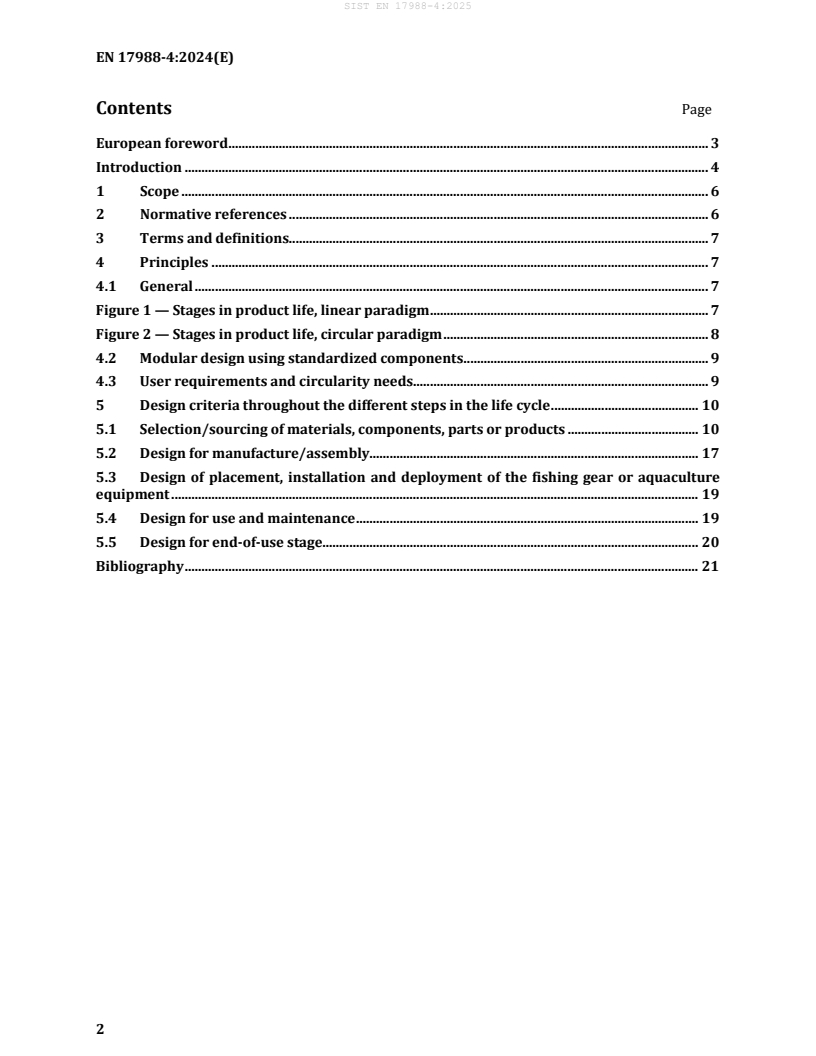 EN 17988-4:2024 - "Circular design of fishing gear and aquaculture equipment - Part 4: Environmental and circularity requirements and guidelines" (CEN) specifies environmental and circularity requirements for components of fishing gear and aquaculture equipment that contain plastics. It sets sustainability principles to minimize the environmental impact of plastic components while taking product performance (e.g., catchability, lifespan) into account. The standard addresses the full product life cycle: selection and sourcing, manufacture and assembly, placement and deployment, use, maintenance and repair, and end-of-use (including transport, storage and distribution where applicable). It excludes fishing or aquaculture technique and management design aspects.