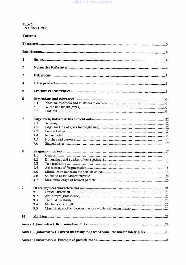 EN 12150-1:2000 is a standard published by the European Committee for Standardization (CEN). Its full title is "Glass in building - Thermally toughened soda lime silicate safety glass - Part 1: Definition and description". This standard covers: This European standard covers tolerances, flatness, edge work, fragmentation and physical and mechanical characteristics of monolithic flat thermally toughened soda lime silicate safety glass for use in buildings. Bent thermally toughened soda lime silicate safety glass is mentioned, but this product is not part of this standard. Other requirements not specified in this standard may apply to thermally toughened soda lime silicate safety glass which is incorporated into assemblies, e.g. laminated glass or insulating units, or undergo an additional treatment, e.g. coating, etc. Thermally toughened soda lime silicate glass, in this case, does not lose its mechanical or thermal characteristics.
