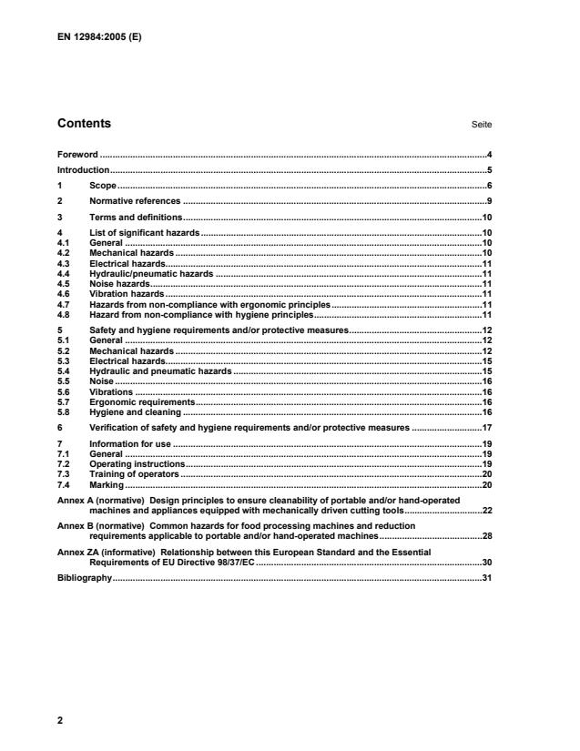 The standard EN 12984:2005 provides comprehensive guidelines focused on portable and/or hand-guided machines and appliances equipped with mechanically driven cutting tools, particularly in the context of food processing. This European Standard has a well-defined scope that meets the specific needs of industries involved in slaughtering animals and butchering various food products like fish. By clearly outlining the safety and hygiene requirements, it serves as a critical resource for manufacturers, ensuring that these machines are both safe and efficient for use in slaughterhouses and food preparation environments. One of the strengths of this standard is its meticulous attention to significant hazards associated with the operation and maintenance of the covered machinery. By addressing hazards that may occur during commissioning, operation, maintenance, and de-commissioning, EN 12984:2005 enhances user safety and promotes compliance with industry regulations. Moreover, the inclusion of detailed categories for different tool types, such as circular saws and various knife configurations, further strengthens its relevance, allowing manufacturers to tailor their compliance efforts according to the specific machinery they produce or utilize. The standard’s emphasis on widely-used machinery types and the hazardous situations that could arise during their operation connects directly to practical applications in food processing. By setting forth stringent design and manufacturing requirements, it aligns with contemporary practices within the trade, emphasizing not only safety but also hygiene, which is paramount in food-related industries. Additionally, the exclusion of machines produced prior to the standard’s publication ensures that all appliances currently in use are held to a consistent and modern benchmark of safety and performance. In summary, EN 12984:2005 is a crucial document for stakeholders in the food processing industry, as it defines essential safety and hygiene requirements that safeguard users while promoting best practices in the design and operation of portable and hand-guided food processing machinery. Its structured approach to addressing significant hazards ensures that users can operate these machines confidently and compliantly within their work environments.