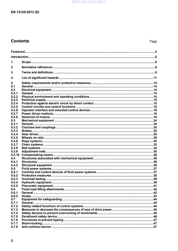 NOTE Specific requirements for particular types of cranes, and for load lifting attachments, are given in the appropriate European Standard. The electrical equipment covered by this European Standard commences at the point of connection of the supply to the crane (the crane supply switch) including systems for power supply and control feeders situated outside the crane, e.g. flexible cables, conductor wires or bars, electric motors and cableless controls. The principles to be applied for cranes transporting hazardous loads are given in this standard. Particular requirements are given for cranes transporting hot molten metal. The standard does not cover the detail design of individual items of equipment except with regard to their selection for specific aspects of use. In general, the proof of competence calculations and related strength requirements or safety margins of equipment and components are not covered by this standard. These questions are covered in EN 13001 parts 1 and 2, and in the EN 13001-3 series that is partly under preparation (see Annex A). Exceptionally, some safety margins are given here for items not covered in EN 13001-series. Hazards due to noise are not covered by this standard. They are addressed in safety standards specific to each type of crane. The specific hazards due to potentially explosive atmospheres, ionising radiation, and operation in electromagnetic fields beyond the range of EN 61000-6-2 are not covered by this European Standard. The significant hazards covered by this European Standard are identified in Clause 4. This European Standard is not applicable to cranes, which are manufactured before the date of publication by CEN of this standard. 2 Normative references The following documents, in whole or in part, are normatively referenced in this document and are indispensable for its application. For dated references, only the edition cited applies. For undated references, the latest edition of the referenced document (including any amendments) applies. EN 818-1, Short link chain for lifting purposes — Safety — Part 1: General conditions of acceptance EN 818-7, Short link chain for lifting purposes — Safety — Part 7: Fine tolerance hoist chain, Grade T (Types T, DAT and DT) EN 1037, Safety of machinery — Prevention of unexpected start-up EN 1561, Founding — Grey cast irons EN 12077-2, Cranes safety — Requirements for health and safety — Part 2: Limiting and indicating devices EN 12385-4, Steel wire ropes — Safety — Part 4: Stranded ropes for general lifting applications EN 12644-2, Cranes — Information for use and testing — Part 2: Marking SIST EN 13135:2013