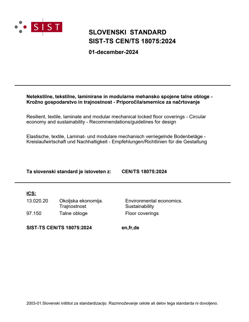 CEN/TS 18075:2024 is a technical specification published by the European Committee for Standardization (CEN). Its full title is "Resilient, textile, laminate and modular mechanical locked floor coverings - Circular economy and sustainability - Recommendations/guidelines for design". This standard covers: The aim of this document is to provide general recommendations and guidelines on how to design a product to optimize its reuse and recyclability at the end of its lifetime as well as to take into account sustainable sourcing of materials for all floor covering product groups covered by CEN/TC 134. The overall target is to avoid waste and pollution and to achieve a product fit for the circular economy. In a linear economy, the focus of product design is on developing new products without considering the recycling or reuse of the raw materials used. This document provides guidance for processes allowing for (raw) materials used to be returned to the economic cycle based on circular design principles. The focus is on open systems that allow for economically interesting alternatives and are not limited to the principle of closed cycles (product to product). Specific attention is given to renewable materials, where applicable. The document is structured along the life cycle of the products, starting with the production phase. Excluded is packaging, which is not considered part of the product end-of-life stage.