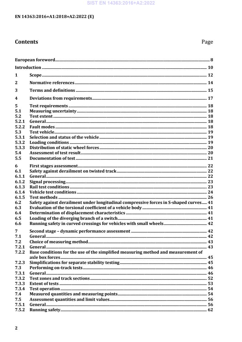 제목: EN 14363:2016+A2:2022 - 철도차량의 주행 특성 수용을 위한 검사 및 시뮬레이션 - 주행 행동 및 정지 시험 내용: 이 유럽 표준은 유럽 표준 게이지(명목적으로 1,435mm) 트랙의 철도차량의 주행 특성 평가 과정을 정의합니다. 이 표준은 수용 프로세스를 위한 차량의 주행 특성 평가뿐만 아니라 직접적으로 수용 목적으로 사용되지 않는 양 및 종속성도 정의합니다. 이 정보는 예를 들어 시뮬레이션 모델의 검증을 위해 사용됩니다. 또한 인가를 위해 사용될 참조 조건 외의 운영 조건을 정의하는 데에도 사용될 수 있습니다. 주행 특성 평가는 다음 조건을 갖는 차량에 적용됩니다. - 개발 중인 차량 - 관련 설계 변경 사항을 가진 차량 - 운영 조건 변경이 있는 차량 평가 과정은 이 문서에서 정의된 목표 시험 조건(3.1 참조)에 기반합니다. 수년간의 경험에 따르면 이 표준을 준수하는 차량은 현재 일반적인 운영 규칙이 적용된 더 요구 조건이 있는 인프라에서 안전하게 운영될 수 있습니다. 예를 들어 일반적으로 현행 관행은 특정 반경 이하의 곡선에서 칸트 하향을 제한하는 것입니다. 인프라 조건의 악화가 관찰되면 이러한 운영 규칙을 조정해야 할 필요가 있을 수 있습니다. 이러한 운영 규칙은 국가적으로 정의됩니다. 이 표준의 범위에서는 이러한 운영 규칙의 평가 절차는 다루지 않습니다. 참고 1: 제시된 한계값과 통계적 평가에는 여유 여백이 포함되어 있습니다. 이 여유 여백은 정량화될 수 없지만, 이것이 많은 경우에 차량이 목표 시험 조건 외부에서도 전속력과 칸트 하향으로 운영될 수 있는 이유를 설명합니다. 이 표준은 또한 조건을 시험 중에 동시에 충족시킬 수 없는 경우 목표 시험 조건에 대한 준수를 증명하는 것을 가능하게 합니다. 테스트 구간 1과 2 또는 속도 및 칸트 하향이 감소한 제한된 시험 조건과 같은 제한된 시험 조건에 대한 차량의 평가도 수행할 수 있습니다. 이 경우 차량의 승인은 그에 따라 제한됩니다. 참고 2: 국가 법규는 국부 운영에 대한 속도, 곡선 반경, 칸트 하향 값의 증가 또는 감소를 허용하기도 하며, 이는 국지적인 인프라 특성(트랙 레이아웃, 트랙 구조, 트랙 기하학적 품질 및 접촉 조건)을 고려한 안전 상의 고려 사항에 기반합니다. 이러한 지역적 특성은 차량 수용을 위한 평가에 포함된 특성과 다를 수 있습니다. 참고 3: 이 표준의 방법은 목표 시험 조건보다 더 요구 조건이 있는 인프라와의 호환성에 대한 정보 수집에도 적용될 수 있습니다. 이러한 조사 결과는 해당 인프라 조건에 대한 안전한 운영 규칙을 결정하는 데에 사용될 수 있습니다. 차량 테스트를 통해 최대 속도 및 최대 칸트 하향 하에서 목표 시험 조건보다 더 엄격한 인프라 조건에서 차량의 성능이 이 표준의 요구 사항을 충족하는 것을 입증하는 경우, 얻은 결과는 수용되며 이 표준에 정의된 요구 사항을 충족하기 위해 추가적인 시험을 수행할 필요가 없습니다. 이 표준은 다음 네 가지 측면을 다룹니다: 1) 차량 주행 특성 평가는 주로 모든 철도차량을 대상으로 합니다. 이 문서에는 공명 정적 수직 활동 휠셋 힘 예비용이 225 kN까지(평가된 하중 구성에서 차량의 가장 부하가 큰 휠셋)인 모든 유형의 차량에 대한 수용 기준이 포함되어 있습니다. 또한, 정적 수직 휠셋 힘이 250 kN까지인 화물 차량에 대한 수용 기준이 정의되어 있습니다. 이 문서에서 제공된 수용 기준은 표준 게이지트랙에서 운영되도록 설계된 차량에 적용됩니다.