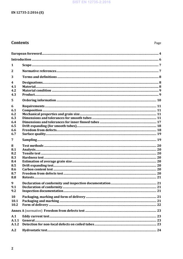 Freedom from defects test . 23 A.1 Eddy current test . 23 A.1.1 General . 23 A.1.2 Detection for non-local defects on coiled tubes . 23 A.2 Hydrostatic test . 24 SIST EN 12735-2:2016