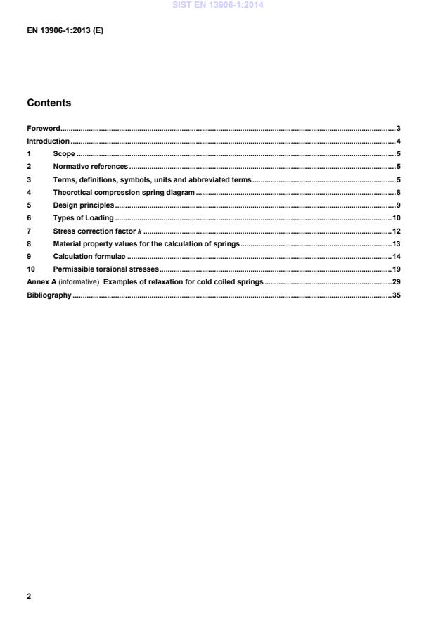 Ta evropski standard določa izračun in načrtovanje hladno in toplo oblikovanih vijačnih valjastih tlačnih vzmeti z linearno karakteristiko, izdelanih iz okrogle žice in palic s konstantnim premerom vrednostmi, skladnimi s preglednico 1, in z glavno obremenitvijo v smeri osi vzmeti.