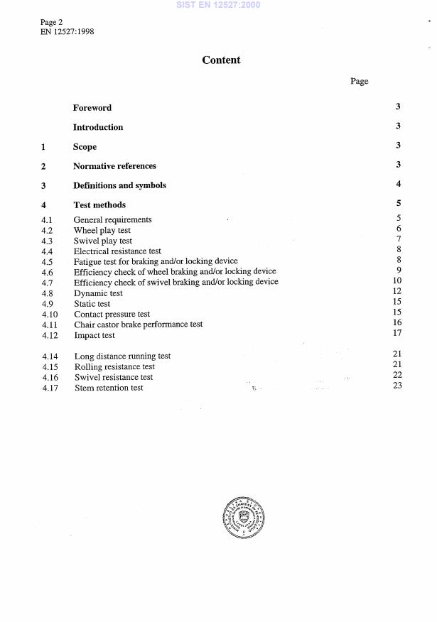 EN 12527:1998 is a standard published by the European Committee for Standardization (CEN). Its full title is "Castors and wheels - Test methods and apparatus". This standard covers: This standard specifies the test methods and apparatus to be used to check the performance of the castors and wheels. The test to be used and the acceptance criteria, values and applicability relevant to each type of castor and wheel are covered by the specific standards.