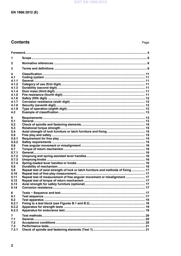 — permanent deformation at (50 ± 2) mm ≤ 5 mm ≤ 5 mm ≤ 5 mm ≤ 5 mm 13 5.14 and 7.4 — Corrosion resistance To conform to the requirements of EN 1670 NOTE Test 11 can be performed after Test 12. 5.2 Check of spindle and fastening elements The spindle and fastening elements should be supplied or specified by the manufacturer with every set of lock or latch furniture. The manufacturer should state clearly the door thickness or range of door thicknesses for which the furniture is suitable, and in the case of spring-assisted and spring-loaded furniture, the angle of rotation possible by the design (see 6.2.1.1 and 7.3.1). 5.3 Rotational torque strength When tested in accordance with 7.3.12, lock or latch furniture shall show no failure of any component and the lever handles or knobs shall still be operational after the test. Lever handles or knobs shall not deform permanently more than 5 mm as measured at (50 ± 2) mm from the axis of rotation by the dial gauge. 5.4 Axial strength of lock furniture or latch furniture and fixing When tested in accordance with 7.3.2, there shall be no failure of any component, and lever handles or knobs shall still be operational after the test. After testing, the permanent deformation for lever handles or knobs measured at the reference point (75 ± 2) mm from the axis of rotation shall not increase by more than 2 mm. 5.5 Free play and safety 5.5.1 Requirement for free play The maximum total movement measured in accordance with 7.3.3 shall not exceed 10 mm for category of use grades 1 and 2, and 6 mm for category of use grades 3 and 4, for lock or latch furniture. This requirement only applies to lever handles and knobs that will not be driven during the endurance test. 5.5.2 Safety requirements When the lock or latch furniture is fitted to the test block there shall be no sharp edges that can cause injury. NOTE This requirement should typically be satisfied by edges that are broken by a chamfer of 0,5 mm maximum × 45° or by a radius of 0,5 mm minimum. In the area of rotation of the lever handle or knob, the head of any visible fastening element shall be level with or below the surface of the backplate or rose after fitting. However, raised head screws may stand proud of the furniture plate by the domed height of the screw head. SIST EN 1906:2012