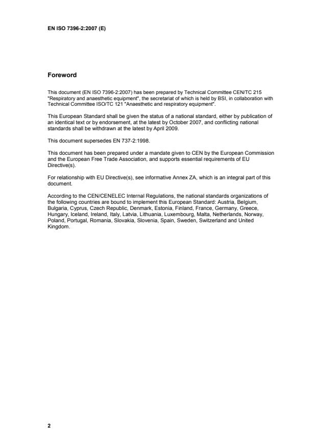 EN ISO 7396-2:2007 has the following relationships with other standards: It is inter standard links to EN 737-2:1998, EN 737-2:1998/A1:1999, EN 737-2:1998/AC:2000. Understanding these relationships helps ensure you are using the most current and applicable version of the standard.