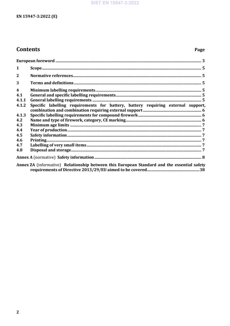 EN 15947-3:2022 is a standard published by the European Committee for Standardization (CEN). Its full title is "Pyrotechnic articles - Fireworks, Categories F1, F2 and F3 - Part 3: Minimum labelling requirements". This standard covers: This document specifies minimum labelling requirements for fireworks and primary and selection packs of fireworks. It is applicable to fireworks of the categories F1, F2 and F3 as defined by Article 6 Paragraph (1) clause (a) subclause (i) to (iii) of Directive 2013/29/EU.