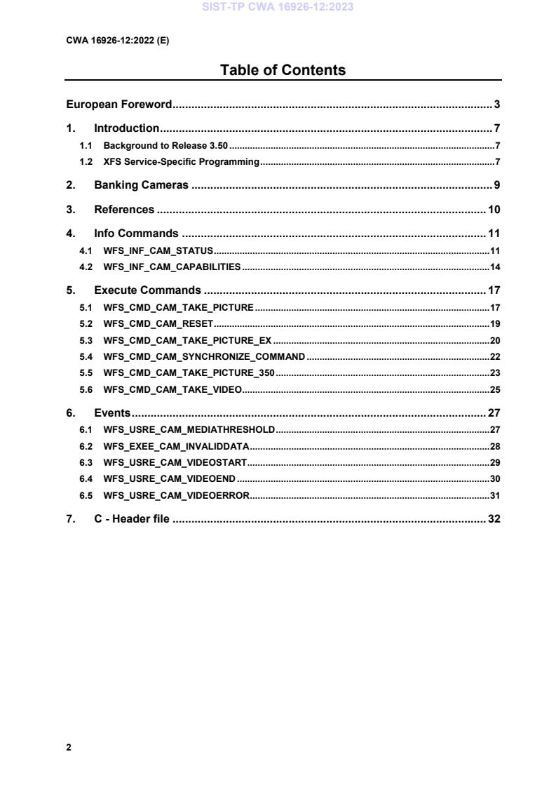 CWA 16926-12:2022 - Camera Device Class Interface - Programmer's Reference is Part 12 of the CEN/XFS Release 3.50 suite. This CEN Workshop Agreement defines the service-specific API for camera (CAM) devices used in financial self‑service environments (ATMs, kiosks). It specifies the commands, info queries and events supported by the XFS Camera service class and describes how applications interact with cameras using the XFS API functions (for example WFSGetInfo, WFSAsyncGetInfo, WFSExecute, WFSAsyncExecute).