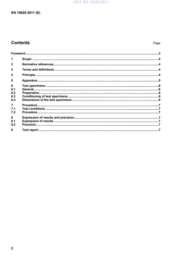 Contents Page Foreword .31Scope .42Normative references .43Terms and definitions .44Principle .45Apparatus .56Test specimens .66.1General .66.2Preparation .66.3Conditioning of test specimens .66.4Dimensions of the test specimens.67Procedure .77.1Test conditions .77.2Procedure .78Expression of results and precision .78.1Expression of results .78.2Precision .79Test report .7 SIST EN 15820:2011