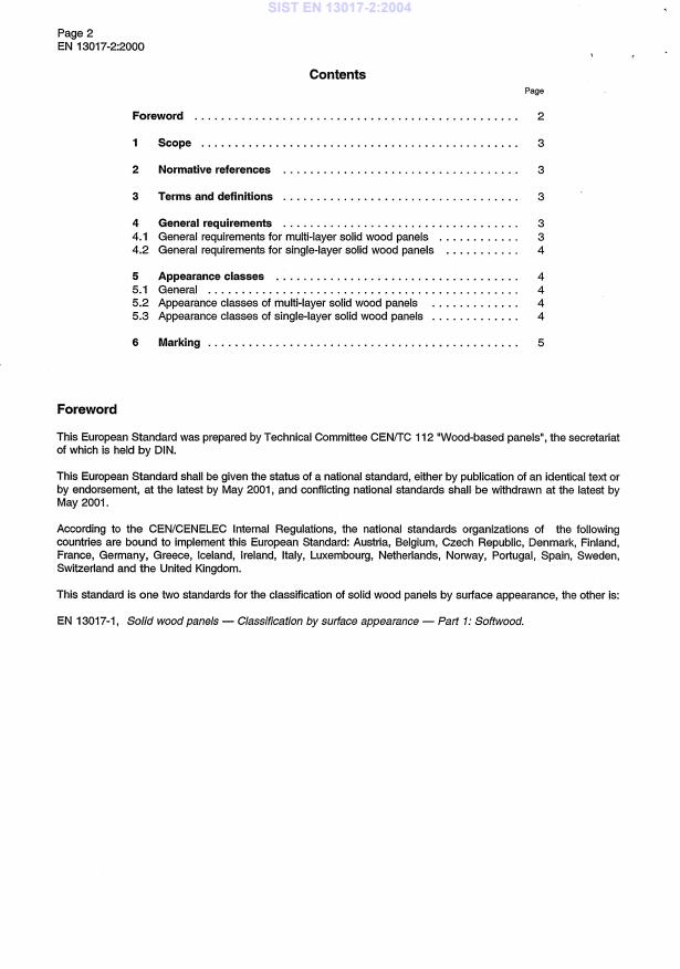 EN 13017-2:2000 is a standard published by the European Committee for Standardization (CEN). Its full title is "Solid wood panels - Classification by surface appearance - Part 2: Hardwood". This standard covers: This European Standard specifies general requirements and appearance classes for both single layer and multi-layer solid wood panels, the latter with a minimum thickness of the outer layers of 3,5 mm, manufactured from hardwood species.