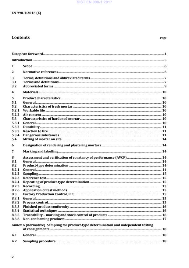 EN 998-1:2016 is a standard published by the European Committee for Standardization (CEN). Its full title is "Specification for mortar for masonry - Part 1: Rendering and plastering mortar". This standard covers: This European Standard is applicable to factory-made rendering/plastering mortars based on inorganic binders for external (rendering) and internal (plastering) use on walls, ceilings, columns and partitions. It contains definitions and final performance requirements. This European Standard provides for the assessment and verification of constancy of performance (AVCP) of the product to this European Standard. The marking requirement for products covered by this European Standard is included. It does not cover mortars where calcium sulphate binder is the principal active binding agent. Calcium sulphate binder can be used as an additional binder together with air lime. If air lime is the principal active binding component, the rendering/plastering mortar is covered by this European Standard. If the calcium sulphate binder is the principal active binding component, the mortar is covered by EN 13279. Special fire resistant- and acoustical mortars, mortars for structural repair and surface treatments of building elements such as materials for smoothing or trueing, paints, coatings, thin-layer organic renders/plasters and prefabricated units (e.g. plasterboards) are not dealt with in this European Standard. This European Standard covers rendering/plastering mortars defined in Clause 3 with the exception of site-made rendering/plastering mortars. However, this European Standard or part of this European Standard may be used in conjunction with codes of application and national specifications covering site-made mortar.