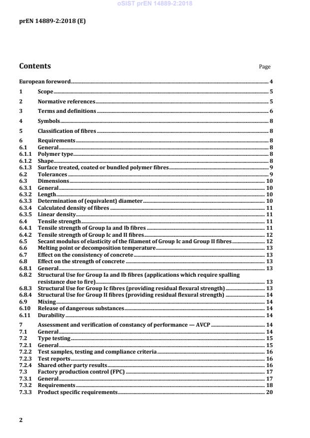 Keywords: polymer fibres for concrete, fibre reinforced concrete, prEN 14889-2, concrete fibres standard, polymer fibre specifications, concrete reinforcement, mortar fibres, fibre properties, CEN standards, concrete durability, fibre tensile strength, concrete fibre classification, European concrete standards.