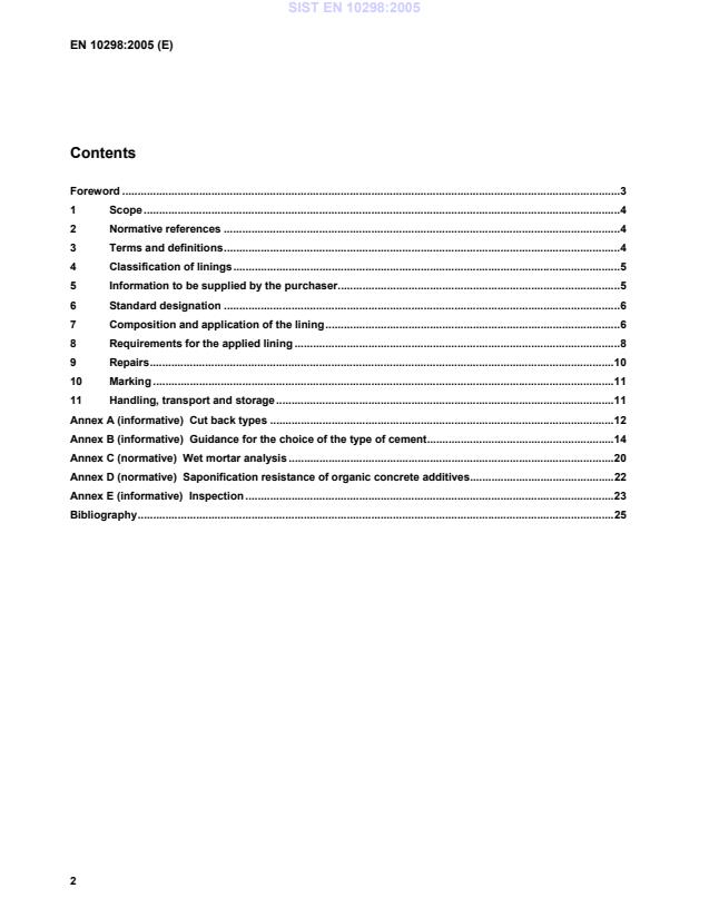 a Abbreviation according to EN 197-1. b For cement CEM I HS (Sulphate Resistance) and CEM CAC (High Aluminium Cement) reference shall be made to European standards when available or to the relevant national standards. 5 Information to be supplied by the purchaser 5.1 Mandatory information to be supplied by the purchaser The purchaser shall state in his enquiry and order the following minimum information: reference to this European standard EN 10298; type of water to be transported in the pipeline; type of cut-back (see annex A); transportation under pressure or by gravity for waste water application. 5.2 Options to be indicated by the purchaser The purchaser may add the following optional information: type of cement; type of additives; method of application; service temperature; application of a pore sealer. SIST EN 10298:2005
