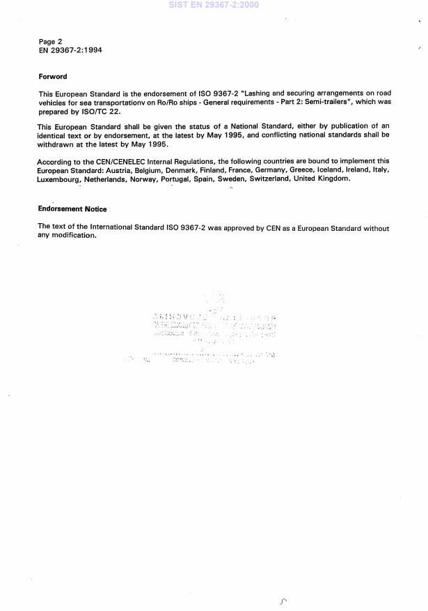 EN 29367-2:1994 is a standard published by the European Committee for Standardization (CEN). Its full title is "Lashing and securing arrangements on road vehicles for sea transportation on Ro/Ro ships - General requirements - Part 2: Semi-trailers (ISO 9367-2:1994)". This standard covers: Specifies the minimum requirements to allow efficient lashing and securing of semi-trailers, as defined in ISO 3833, on board Ro/Ro ships, indicating in particular the lashing arrangements on the semi-trailer and the securing method to be used. Annex A gives, for information to semi-trailer designers, the securing point arrangements generally used on Ro/Ro ships, annex B describes for information some design indications to decrease damage during handling.
