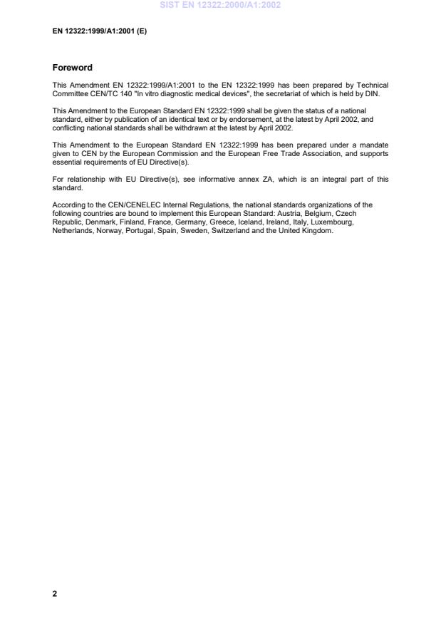 EN 12322:1999/A1:2001 is associated with the following European legislation: EU Directives/Regulations: 93/42/EEC, 98/79/EC; Standardization Mandates: M/252. When a standard is cited in the Official Journal of the European Union, products manufactured in conformity with it benefit from a presumption of conformity with the essential requirements of the corresponding EU directive or regulation.