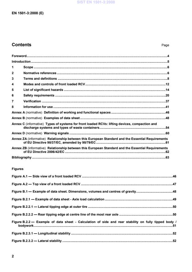 Introduction This document is a type C standard as stated in EN ISO 12100-1. The machinery concerned and the extent to which hazards, hazardous situations and events are covered are indicated in the scope of this document. When provisions of this type C standard are different from those which are stated in type A or B standards, the provisions of this type C standard take precedence over the provisions of the other standards, for machines that have been designed and built according to the provisions of this type C standard. The series of standards should be read in conjunction with the documents developed by CEN/TC 183/WG 1 for mobile waste containers (according to the series of standards EN 840), for stationary waste containers (according to the series of standards EN 12574) and for selective collection containers emptied by the top (Type B of EN 13071) that are compatible with some of the lifting devices specified in this standard (see Figure C.4). While producing this standard it was assumed that: only persons who have been appropriately trained will operate the front loaded RCV; the guidelines issued by the chassis manufacturer have been taken into account; components without specific requirements are designed in accordance with the usual engineering practice and calculation codes, including all failure modes, of sound mechanical and electrical construction and made of materials with adequate strength and of suitable quality; harmful materials, such as asbestos, are not used as part of the machine; components are kept in good repair and working order, so that the characteristics, within the specified limits as stated in the maintenance manual, remain despite wear; by design of the load bearing elements, a safe operation of the machine is assured for loading ranging from zero to 100 % of the rated capacities; the equipment has been designed for operation with an ambient temperature between –25 °C and 40 °C; specific uses and operating conditions of the machinery are taken into account by negotiation between the manufacturer and the user (for example: type of waste, extended temperature range, type of driving conditions). The standard is designed for careful consideration by designers, manufacturers, suppliers and users of the front loaded RCV. SIST EN 1501-3:2008