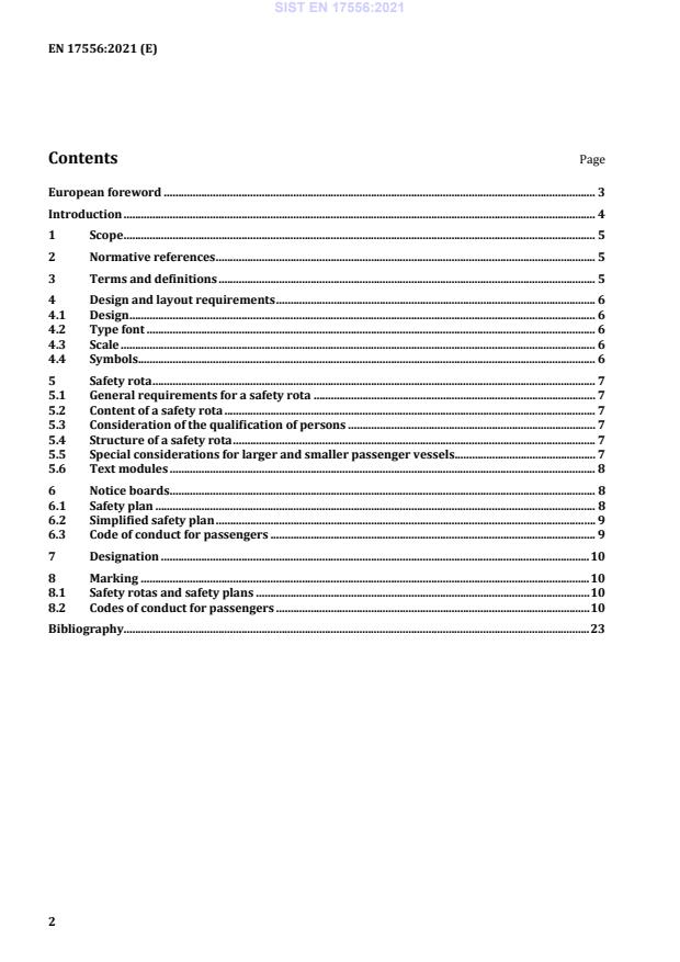 EN 17556:2021 is a standard published by the European Committee for Standardization (CEN). Its full title is "Inland navigation vessels - Safety rota and safety plans for passenger vessels". This standard covers: This document provides guidelines for the preparation of a safety rota and safety plans on passenger vessels for inland navigation. It supports the safety organization on board. Furthermore, it describes the code of conduct necessary for passengers on cabin vessels. Annex B contains an example of a safety rota, a safety plan and a code of conduct for passengers, respectively.