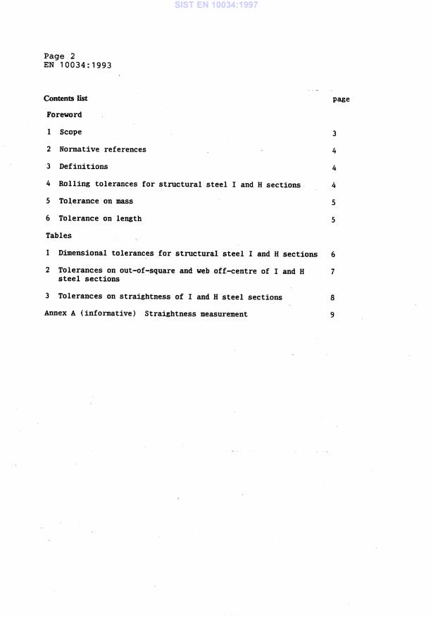EN 10034:1993 is a standard published by the European Committee for Standardization (CEN). Its full title is "Structural steel I and H sections - Tolerances on shape and dimensions". This standard covers: This European standard specifies tolerances on shape dimensions and mass of structural steel I and H sections. These requirements do not apply to I and H sections rolled from stainless steel. These requirements do not apply to taper flange sections. Note: Until a European standard for dimensions of I and H beams is published, Euronorm 19 and Euronorm 53 or corresponding national standards may be used.