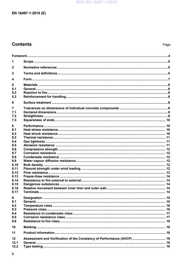 Foreword .4 1 Scope .5 2 Normative references .5 3 Terms and definitions .5 4 Form .7 5 Materials .8 5.1 General .8 5.2 Reaction to fire .8 5.3 Reinforcement for handling .8 6 Surface treatment .9 7 Tolerances on dimensions of individual concrete components .9 7.1 Declared dimensions .9 7.2 Straightness .9 7.3 Squareness of ends . 10 8 Performance . 10 8.1 Heat stress resistance . 10 8.2 Heat shock resistance . 10 8.3 Thermal resistance . 11 8.4 Gas tightness . 11 8.5 Abrasion resistance . 11 8.6 Compressive strength . 12 8.7 Corrosion resistance . 12 8.8 Condensate resistance . 12 8.9 Water vapour diffusion resistance . 12 8.10 Bulk density . 12 8.11 Flexural strength under wind loading . 12 8.12 Flow resistance . 13 8.13 Freeze-thaw resistance . 14 8.14 Resistance to fire external to external . 14 8.15 Dangerous substances . 14 8.16 Relative movement between inner liner and outer wall . 14 8.17 Terminals . 14 9 Designation . 15 9.1 General . 15 9.2 Temperature class . 16 9.3 Pressure class . 16 9.4 Resistance to condensate class . 17 9.5 Corrosion resistance class . 17 9.6 Resistance to fire class . 18 10 Marking . 18 11 Product information. 18 12 Assessment and Verification of the Constancy of Performance (AVCP) . 19 12.1 General . 19 12.2 Type testing . 19 SIST EN 16497-1:2015