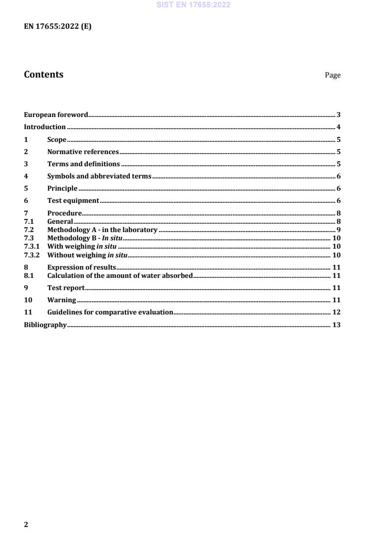 EN 17655:2022 is a standard published by the European Committee for Standardization (CEN). Its full title is "Conservation of cultural heritage - Determination of water absorption by contact sponge method". This standard covers: This document establishes the methodology to measure the quantity of water absorbed by a defined surface of a porous inorganic material used for and constituting cultural property, by contact sponge method. The method can be used on porous inorganic materials which are untreated or have undergone any treatment or ageing. The method can be used both in the laboratory and in situ on flat surfaces. NOTE 1 Treated materials are those which have been subjected to cleaning; to the application of water repellent, consolidating and/or biocidal products; to artificial aging tests, etc. NOTE 2 The test is not intended to be used on surfaces which are severely deteriorated, where application of the sponge is likely to cause material loss. The operator is expected to ensure good contact with the perimeter of the container. The test is not accurate when applied to rough surfaces.