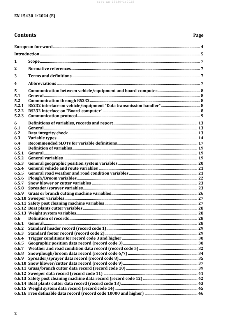 - Variables & records: Standardized variable types and recommended slots; predefined records cover geographic position, vehicle/route, road/weather conditions, plough/broom, spreader/sprayer, snow blower, sweeper, weight systems and more (record codes and trigger conditions specified).