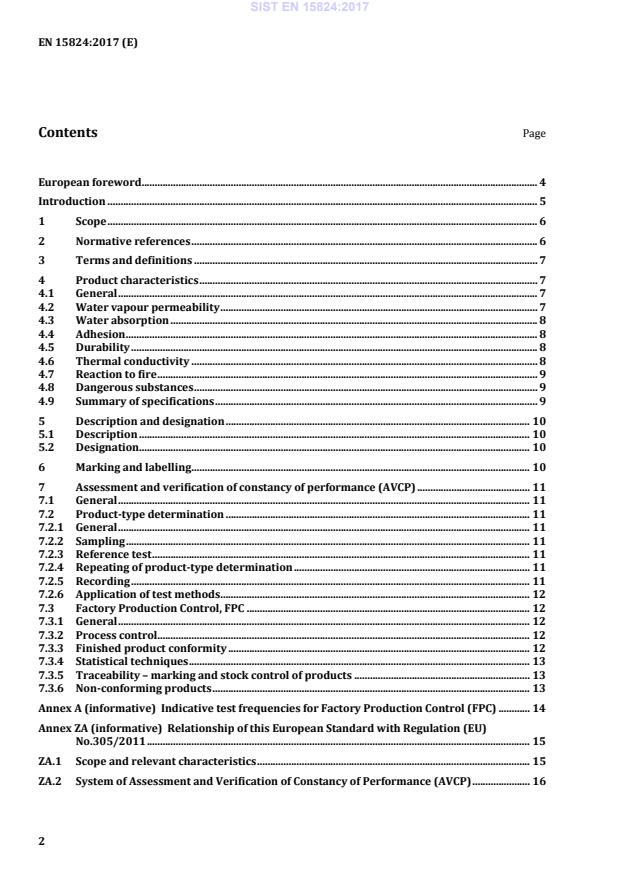 European foreword . 4 Introduction . 5 1 Scope . 6 2 Normative references . 6 3 Terms and definitions . 7 4 Product characteristics . 7 4.1 General . 7 4.2 Water vapour permeability . 7 4.3 Water absorption . 8 4.4 Adhesion . 8 4.5 Durability . 8 4.6 Thermal conductivity . 8 4.7 Reaction to fire . 9 4.8 Dangerous substances . 9 4.9 Summary of specifications . 9 5 Description and designation . 10 5.1 Description . 10 5.2 Designation. 10 6 Marking and labelling . 10 7 Assessment and verification of constancy of performance (AVCP) . 11 7.1 General . 11 7.2 Product-type determination . 11 7.2.1 General . 11 7.2.2 Sampling . 11 7.2.3 Reference test . 11 7.2.4 Repeating of product-type determination . 11 7.2.5 Recording . 11 7.2.6 Application of test methods . 12 7.3 Factory Production Control, FPC . 12 7.3.1 General . 12 7.3.2 Process control. 12 7.3.3 Finished product conformity . 12 7.3.4 Statistical techniques . 13 7.3.5 Traceability – marking and stock control of products . 13 7.3.6 Non-conforming products . 13 Annex A (informative)