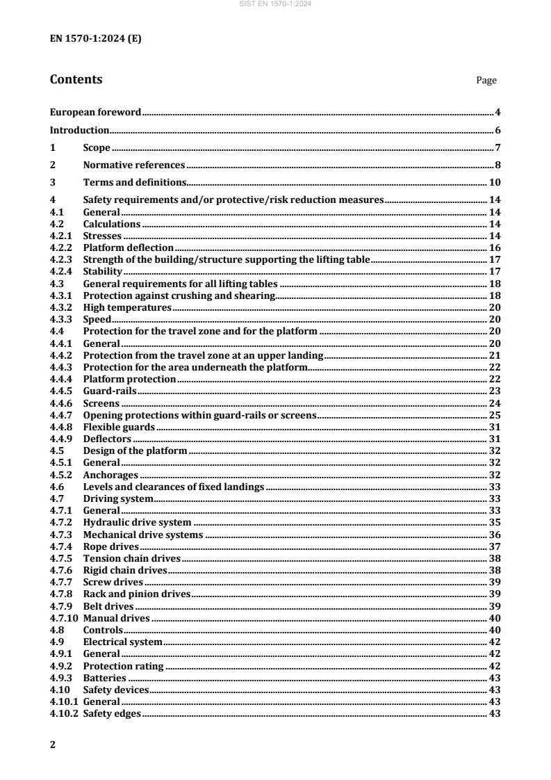 The EN 1570-1:2024 standard provides comprehensive safety requirements for lifting tables serving up to two fixed landings, establishing a crucial framework for manufacturers and operators to ensure safety and compliance in their lifting table operations. The document specifies that suitable lifting tables must operate with a vertical travel speed of no more than 0.15 m/s, enhancing user safety through controlled speed limits. This particular standard is highly relevant for industries engaged in the logistics and construction sectors, where such equipment is frequently employed to move goods and personnel. One of the key strengths of EN 1570-1:2024 is its detailed identification of significant hazards associated with lifting tables, as outlined in Annex B. This systematic approach allows stakeholders to implement appropriate technical measures to eliminate or mitigate risks effectively. By emphasizing the need for safety features tailored specifically for lifting tables, the standard helps promote a culture of safety and accountability within organizations utilizing such equipment. Moreover, by clearly delineating which types of lifting tables are exempt from the specifications-such as those with a vertical travel speed exceeding the specified limit or designed for specific operational environments-EN 1570-1:2024 ensures that operators are aware of the limitations and intended use cases of the standard. This clarity prevents potential misuse of equipment that could pose safety risks. The omission of additional requirements for specific challenges provides a focused scope that facilitates easier compliance for manufacturers, while encouraging them to invest in safety advancements where necessary. The document encourages ongoing improvements in design and safety features, ensuring that the lifting tables can be operated safely by either goods or personnel when positioned properly. Overall, the relevance of EN 1570-1:2024 in the context of lifting tables cannot be understated. It serves not only as a regulatory framework for safety but also as a guide for best practices in the industry. With its clearly defined scope and emphasis on risk management, EN 1570-1:2024 stands as a significant standard for anyone involved in the design, manufacturing, or operation of lifting tables, ultimately contributing to the safer use of such critical equipment in various sectors.