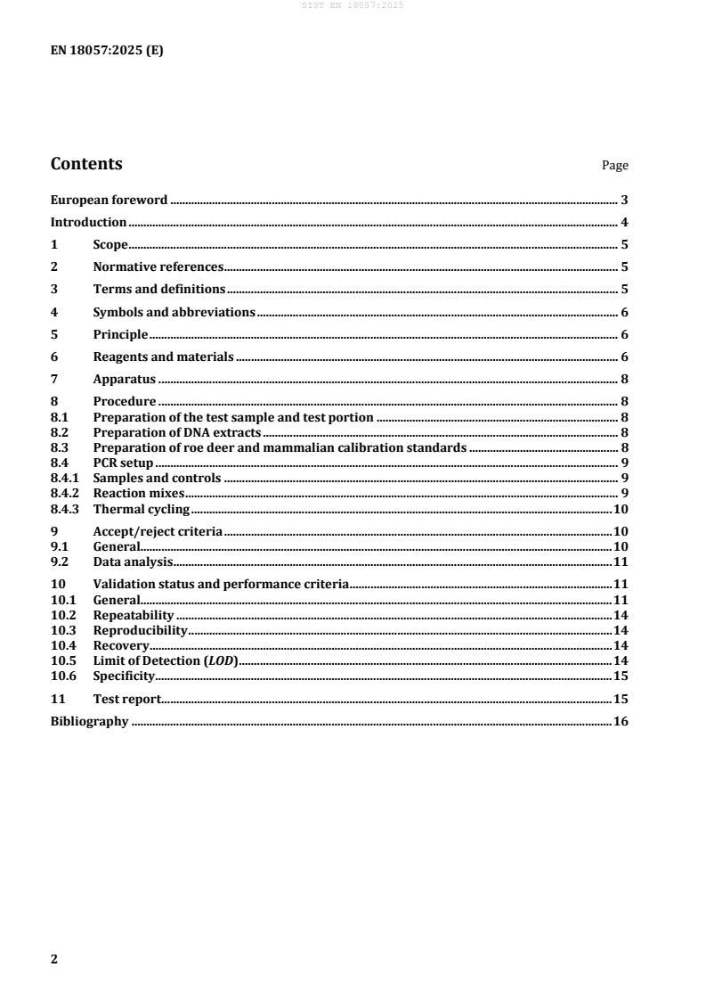 Ta dokument določa postopek verižne reakcije s polimerazo (PCR) v realnem času za kvantitativno določanje DNK srnjadi glede na skupno DNK sesalcev v mesu in mesnih izdelkih. Rezultati tega testa srnjadi so izraženi kot število kopij haploidnega genoma srnjadi (Capreolus capreolus) glede na skupno število kopij haploidnega genoma sesalcev. Vsebnost srnjadi je mogoče izraziti tudi kot masni delež v odstotkih (%) z uporabo gravimetrično pripravljenega materiala za kalibracijo iz mešanic mesa ali modelnih vzorcev. Metoda je bila predhodno potrjena v sodelovalni študiji in uporabljena za DNK, ekstrahirano iz vzorcev surovega srnjega mesa z vsebnostjo surovega svinjskega mesa ter surovih in obarjenih klobas. Meja detekcije verižne reakcije s polimerazo za srnjad je bila eksperimentalno določena na vsaj 5 kopij ciljnega gena oziroma 0,1 % srnjadi. Postopek ocenjevanja skladnosti ni del tega dokumenta.