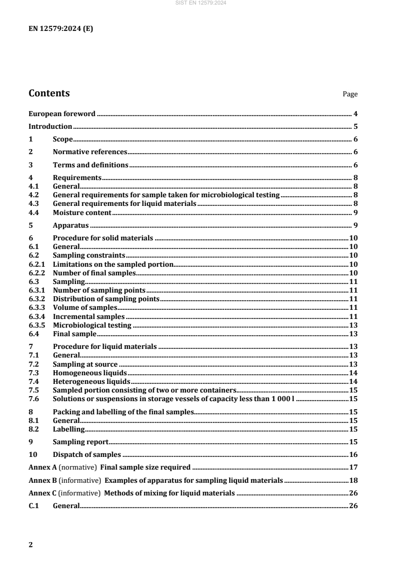 - Liquid materials procedure: added for EN 12579:2024 - sampling at source, handling homogeneous vs heterogeneous liquids, mixing methods and special precautions for multi-phase liquids or volatile materials.
