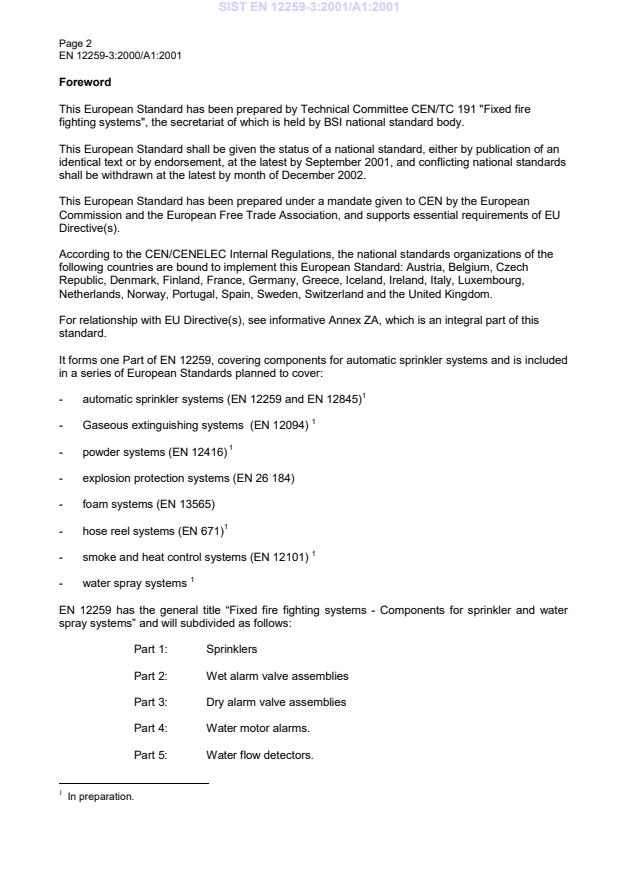 This amendment A1 modifies the European Standard EN 12259-3:2000; it was approved by CEN on 20 January 2001.