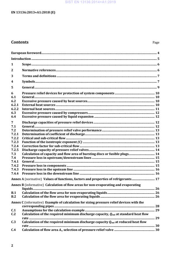 Example of calculation for sizing pressure relief devices with the corresponding pipes . 28 C.1 Assumptions for the calculation example . 29 C.2 Calculation of the required minimum discharge capacity, Qmd at standard heat flow rate . 29 C.3 Calculation of the required minimum discharge capacity Qmd at reduced heat flow rate . 30 C.4 Calculation of flow area Ac, selection of pressure relief valve . 30 SIST EN 13136:2014+A1:2019