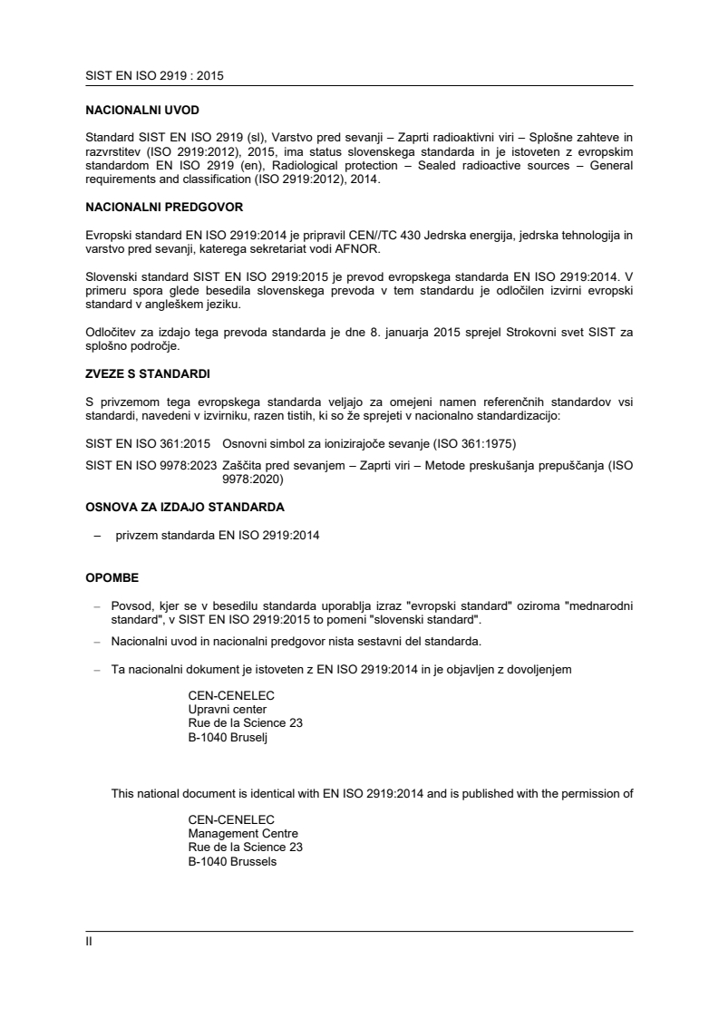 EN ISO 2919:2014 is adopted by CEN and nationally implemented (e.g., SIST EN ISO 2919:2015), making it a key reference for harmonized radiological protection and sealed‑source safety across jurisdictions.