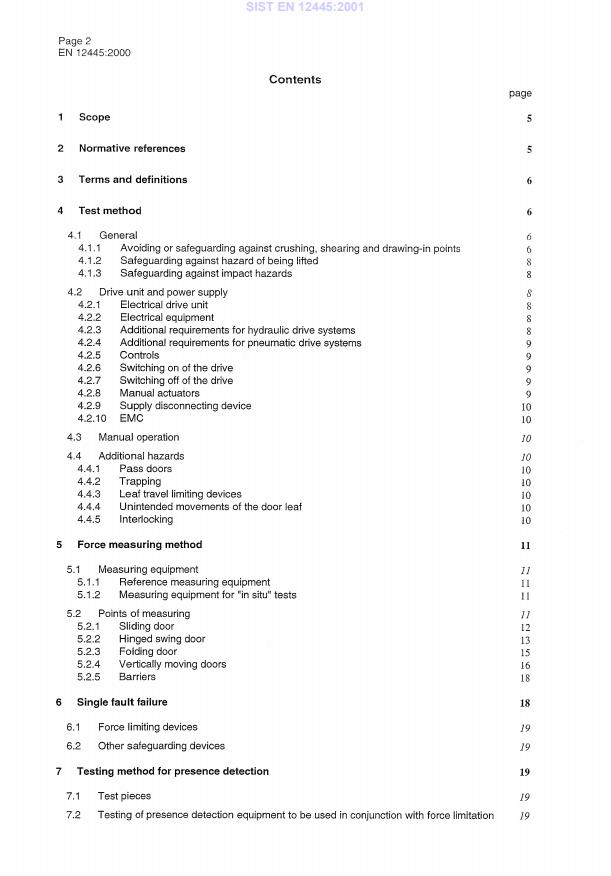 SIST EN 12445:2001 표준은 산업, 상업, 그리고 차고용 문 및 게이트의 안전성을 평가하기 위한 중요한 검사 방법을 제시합니다. 이 표준은 전원 작동 문이 prEN 12453:2000에서 명시된 요구 사항을 준수하는지를 입증하기 위해 적용되는 시험 방법을 구체적으로 규정하고 있습니다. 표준의 주요 강점은 전원 작동 문의 힘을 측정하는 방법을 명확히 지정하고 있다는 점입니다. 이를 통해 제작사와 사용자는 제품의 안전성을 평가하고, 사고를 예방하기 위한 조치를 취할 수 있게 됩니다. 또한, EN 12445:2000 표준은 모든 전원 작동 문에 적용 가능하므로, 다양한 산업 및 상업 분야에서 동일한 안전 기준을 유지할 수 있도록 돕습니다. 이 문서는 전원 작동 문 사용 시 안전성을 보장하기 위한 필수적인 표준으로, 이를 준수함으로써 운영 중 발생할 수 있는 여러 위험 요소를 사전에 차단할 수 있습니다. 따라서 SIST EN 12445:2001은 전원 작동 문에 대한 안전 검사를 위한 신뢰할 수 있는 기준을 제공하며, 산업 전반에서의 안전성을 향상시킬 수 있는 중요한 역할을 합니다.
