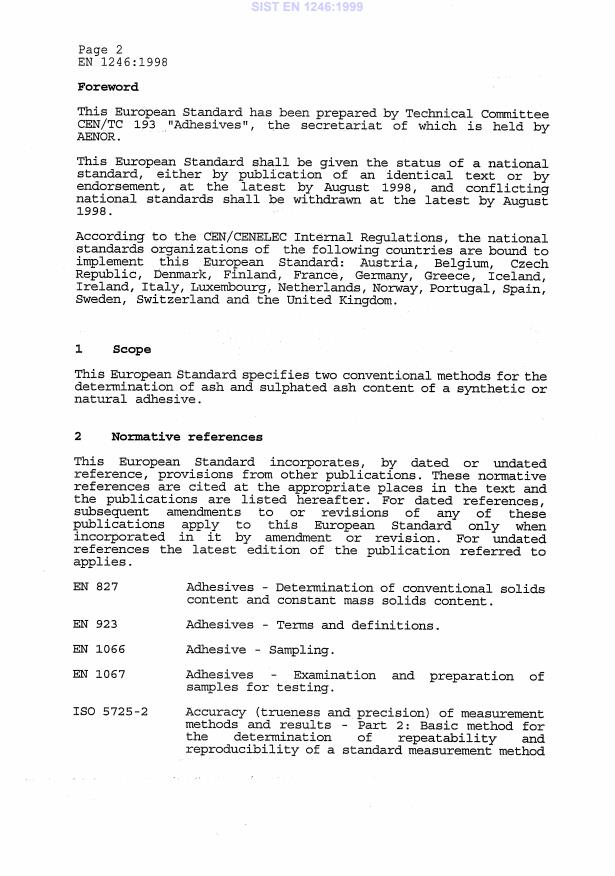 EN 1246:1998 is a standard published by the European Committee for Standardization (CEN). Its full title is "Adhesives - Determination of ash and sulphated ash". This standard covers: This European Standard specifies two conventional methods for the determination of ash and sulphated ash content of a synthetic or natural adhesive.
