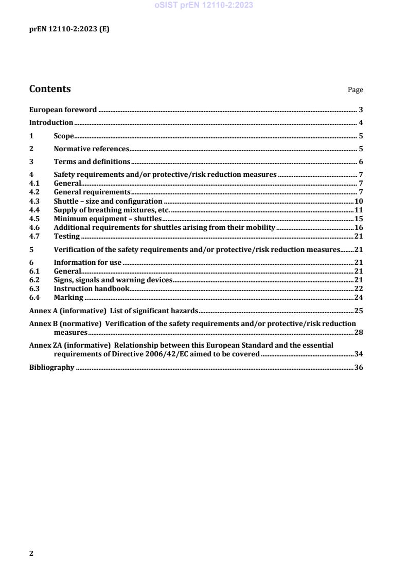 FprEN 12110-2 is a draft published by the European Committee for Standardization (CEN). Its full title is "Tunnel boring machines - Air locks - Part 2: Safety requirements for the use of non-air breathing mixtures and saturation techniques in personnel locks and for pressurized transfer shuttles". This standard covers: This document sets out additional requirements to those in prEN 12110-1 for personnel locks which are intended to have the capability for mixed gas breathing techniques or saturation techniques at pressures not exceeding 20 bar(g) and associated with tunnelling work. This document also sets out requirements for pressurized transfer shuttles as defined in 3.1. prEN 12110-1 applies to the design, construction, equipping, marking and testing of air locks, as defined in 3.3, in tunnelling. prEN 12110-1 also covers requirements for manlocks utilizing compressed air as the pressurizing and breathing medium along with requirements for oxygen breathing systems for decompression purposes. Air locks are normally an integral part of TBMs. Hence there are interfaces between the scope of prEN 12110-1:2023 and prEN 16191:2022. These are detailed in Clause 4 of this document. The intended use of the machinery is agreed between the manufacturer and the user taking into account information on intended use, exposure techniques and decompression procedures provided by the user. This document is not applicable to machinery and equipment which is manufactured before the date of publication of this document by CEN. NOTE This document can help the design of air locks and bulkheads in other compressed air work in construction. This document deals with all significant hazards, hazardous situations and events relevant to such machinery when they are used as intended and under conditions of misuse which are reasonably foreseeable by the manufacturer (see Annex A). This document does not cover the supply of services to the air lock from beyond the defined prEN 12110 1:2023/prEN 16191:2022 interface. This interface is set out in the text. Vibration, noise and EMC (Electromagnetic compatibility) hazards are not significant hazards for air locks. The provision of mixed gas, air or oxygen is the responsibility of the user. During transfer under pressure operations, the shuttle requires a fire suppression system, a climate control system, a power supply and a gas supply. Of these, the fire suppression system requires to be continuously connected and available for immediate activation. It is therefore considered to be part of the shuttle equipment covered by this standard as is the power supply. For the other two services only the capability to supply them is considered to be part of the shuttle requirements.