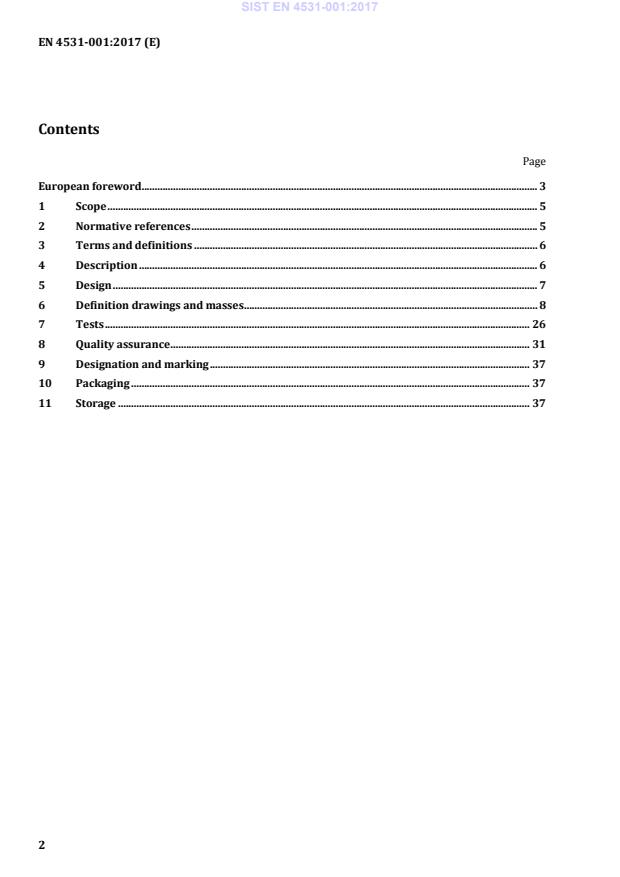 Page European foreword . 3 1 Scope . 5 2 Normative references . 5 3 Terms and definitions . 6 4 Description . 6 5 Design . 7 6 Definition drawings and masses . 8 7 Tests . 26 8 Quality assurance . 31 9 Designation and marking . 37 10 Packaging . 37 11 Storage . 37