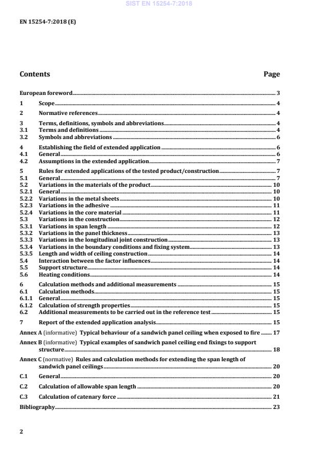 Rules and calculation methods for extending the span length of sandwich panel ceilings . 20 C.1 General . 20 C.2 Calculation of allowable span length . 20 C.3 Calculation of catenary force . 21 Bibliography . 23 SIST EN 15254-7:2018