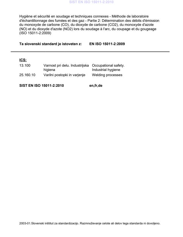 2003-01.Slovenski inštitut za standardizacijo. Razmnoževanje celote ali delov tega standarda ni dovoljeno.Arbeits- und Gesundheitsschutz beim Schweißen und bei verwandten Verfahren - Laborverfahren zum Sammeln von Rauch und Gasen - Teil 2: Bestimmung der Emissionsraten von Kohlenmonoxid (CO), Kohlendioxid (CO2), Stickstoffmonoxid (NO) und Stickstoffdioxid (NO2) beim Lichtbogenschweißen, Schneiden und Fugenhobeln (ISO 15011-2:2009)Health and safety in welding and allied processes - Laboratory method for sampling fume and gases - Part 2: Determination of the emission rates of carbon monoxide (CO), carbon dioxide (CO2), nitrogen monoxide (NO) and nitrogen dioxide (NO2) during arc welding, cutting and gouging (ISO 15011-2:2009)01-april-2010SIST EN ISO 15011-2:2010SLOVENSKI