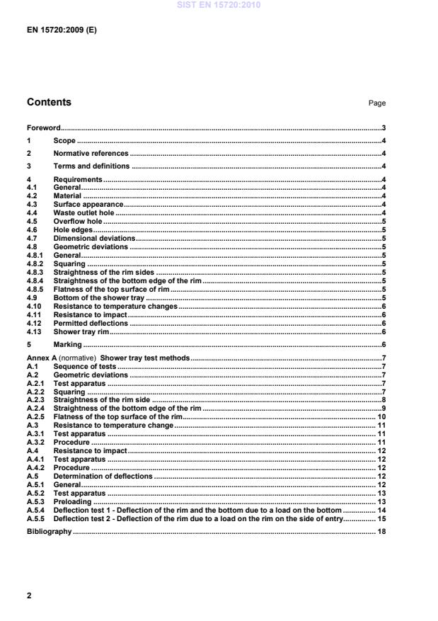 Shower tray test methods .7A.1 Sequence of tests .7A.2 Geometric deviations .7A.2.1 Test apparatus .7A.2.2 Squaring .7A.2.3 Straightness of the rim side .8A.2.4 Straightness of the bottom edge of the rim .9A.2.5 Flatness of the top surface of the rim. 10A.3 Resistance to temperature change . 11A.3.1 Test apparatus . 11A.3.2 Procedure . 11A.4 Resistance to impact . 12A.4.1 Test apparatus . 12A.4.2 Procedure . 12A.5 Determination of deflections . 12A.5.1 General . 12A.5.2 Test apparatus . 13A.5.3 Preloading . 13A.5.4 Deflection test 1 - Deflection of the rim and the bottom due to a load on the bottom . 14A.5.5 Deflection test 2 - Deflection of the rim due to a load on the rim on the side of entry . 15Bibliography . 18 SIST EN 15720:2010