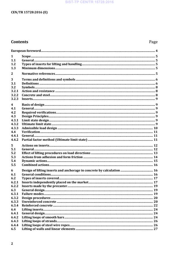 1.1 General This Technical Report provides recommendations for the choice and use of cast-in steel lifting inserts, hereafter called 'inserts' for the handling of precast concrete elements. They are intended for use only during transient situations for lifting and handling, and not for the service life of the structure. The choice of insert is made according to the lifting capacity of their part embedded in the concrete, or may be limited by the capacity of the insert itself and the corresponding key declared by the insert manufacturer. The report covers commonly used applications (walls/beams/columns and solid slabs and pipes). The range of these applications is further limited to prevent other types of failure than concrete breakout failure (cone failure), bond failure, failure of reinforcement or failure in the steel insert. Due to lack of information this report does not cover double shell walls, floor plates and beams for beam-and-block floor systems. The safety levels are given for information and are intended for short-term-handling and transient situations. This Technical Report applies only to precast concrete elements made of normal weight concrete and manufactured in a factory environment and under a factory production control (FPC) system (in accordance with EN 13369:2013, 6.3) covering the insert embedment. This Technical Report does not cover: - the design of the lifting inserts independently placed on the market; - lifting inserts for permanent and repeated use. This Technical Report is prepared based on the fact that the anchorage in the concrete of parts of the lifting assembly is governed by the Construction Products Regulation. Lifting accessories independently placed on the market are governed by the Machinery Directive. 1.2 Types of inserts for lifting and handling This Technical Report applies to the embedment of lifting inserts. Devices made by the precaster may consist of smooth bars, prestressing strands, steel plates with anchorage or steel wire ropes. The system devices may be e.g. internal threaded inserts, flat steel inserts and headed inserts. Lifting loops of ribbed bars are not covered. 1.3 Minimum dimensions This Technical Report applies in general to inserts with a minimum nominal diameter of 6 mm or the corresponding cross section. In general, the minimum anchorage depth should be hef = 40 mm. Wire ropes of diameter less than 6 mm are not covered.