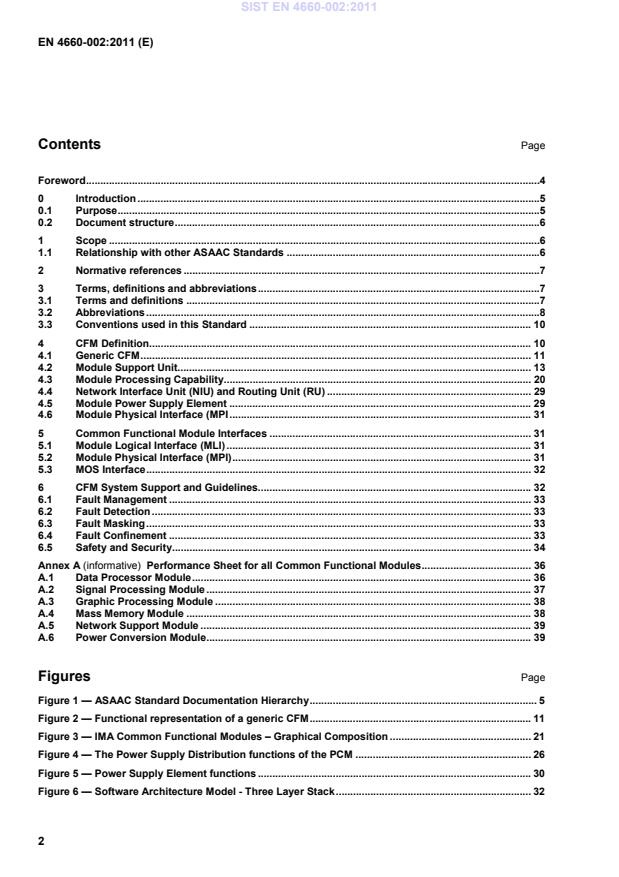 Performance Sheet for all Common Functional Modules . 36A.1Data Processor Module . 36A.2Signal Processing Module . 37A.3Graphic Processing Module . 38A.4Mass Memory Module . 38A.5Network Support Module . 39A.6Power Conversion Module . 39 Figures Page Figure 1 — ASAAC Standard Documentation Hierarchy . 5 Figure 2 — Functional representation of a generic CFM . 11 Figure 3 — IMA Common Functional Modules – Graphical Composition . 21 Figure 4 — The Power Supply Distribution functions of the PCM . 26 Figure 5 — Power Supply Element functions . 30 Figure 6 — Software Architecture Model - Three Layer Stack . 32 SIST EN 4660-002:2011